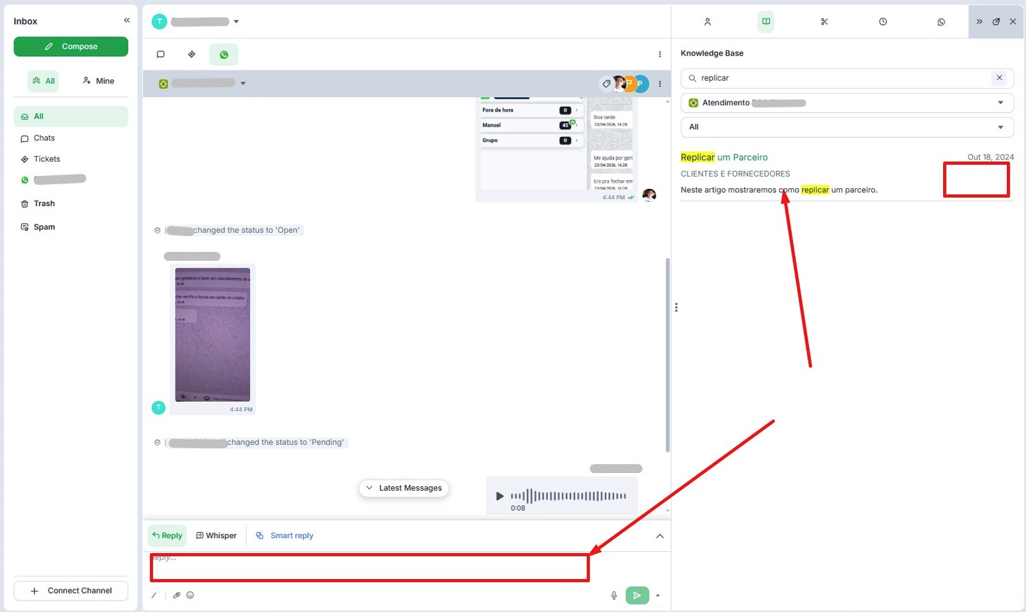 In the inbox when replying to a support request received via WhatsApp, the option to add knowledge base links to the conversation does not appear. This option is available in live chats, but not in WhatsApp conversations. Is there any way to adjust or improve this?