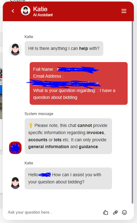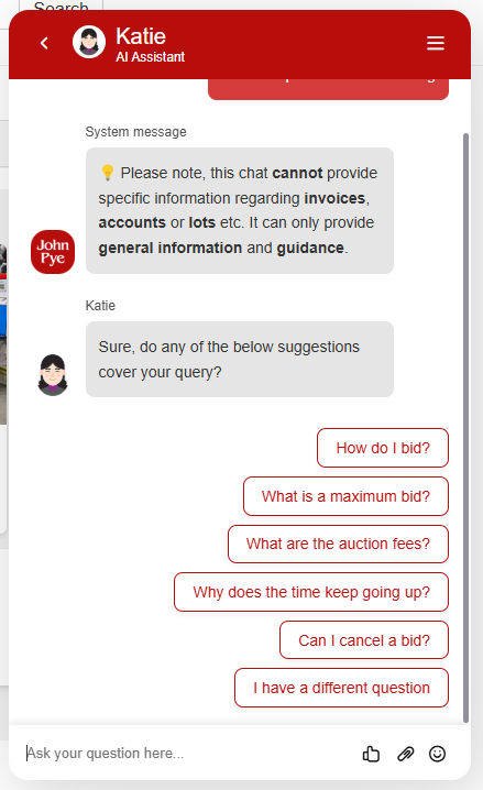 Which is not ideal. Is there a way (using the base prompt) I can get the AI to ignore all the text from the pre-chat and only acknowledge text after "What is your question regarding: " as I have “I have a qustion about bidding” as a trigger for a shortcut that brings up more suggested messages. Ideally, it should look like this: